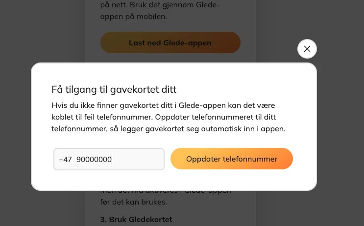 Har du problem med att logga in? Glede app eller kan inte hitta Glede -presentkortet inuti Glede app? I 99,9 % av fallen beror detta på att fel telefonnummer är kopplat till din gåva. Lyckligtvis är detta enkelt att åtgärda! Följ den här enkla guiden så löses problemet på under två minuter.