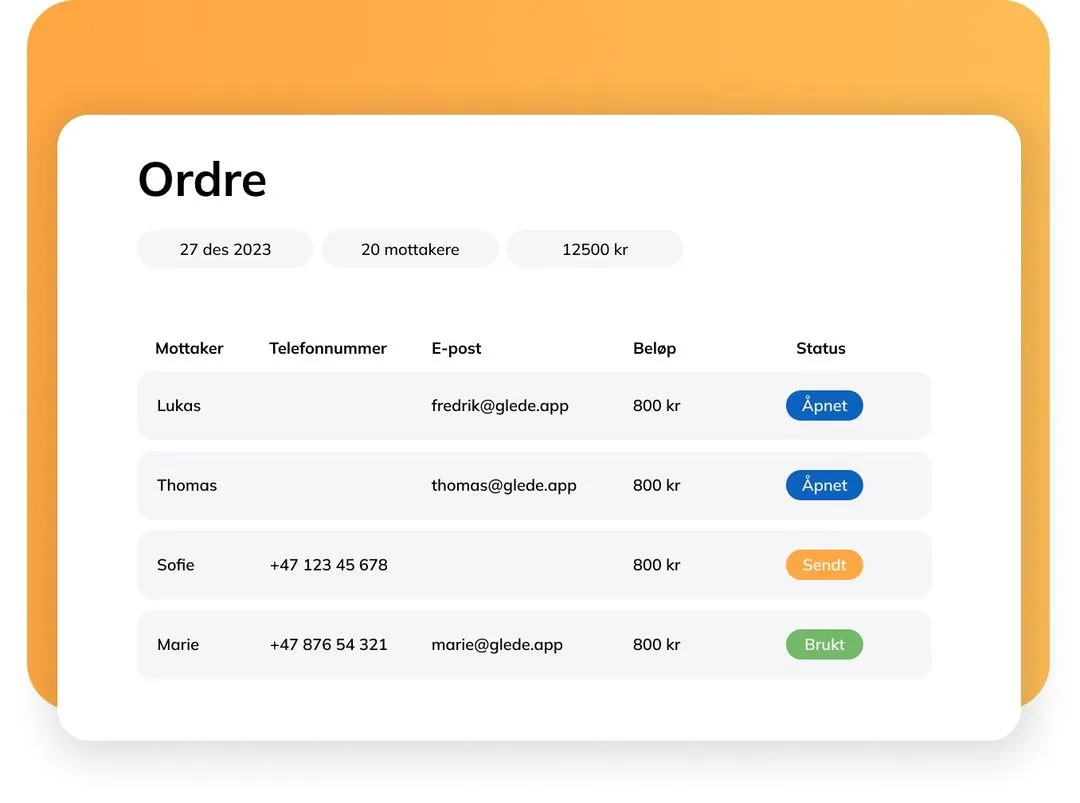 Glede Plattformen erbjuder möjligheten att planera framtida utskick och få full insyn i presentkortsanvändningen i efterhand. Detta gör det enkelt för företaget att hålla reda på vilka presenter som har skickats ut och hur de används. Den ger också en databas för att bedöma presentprogrammets effektivitet och göra nödvändiga justeringar.